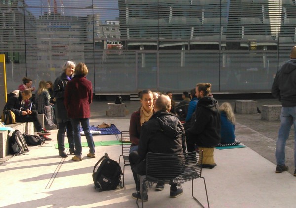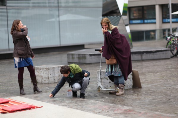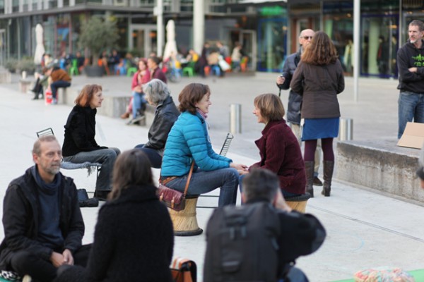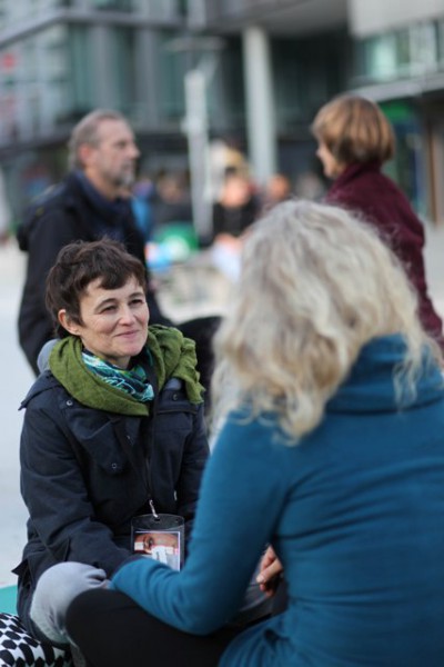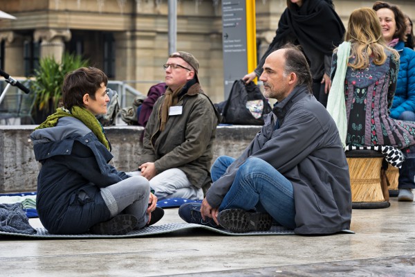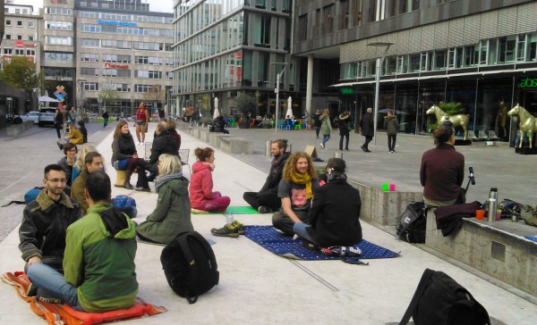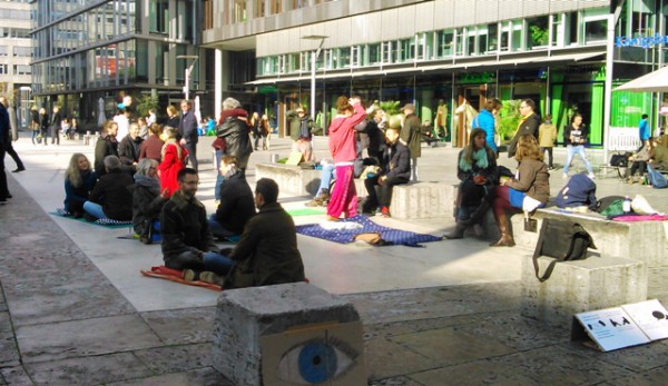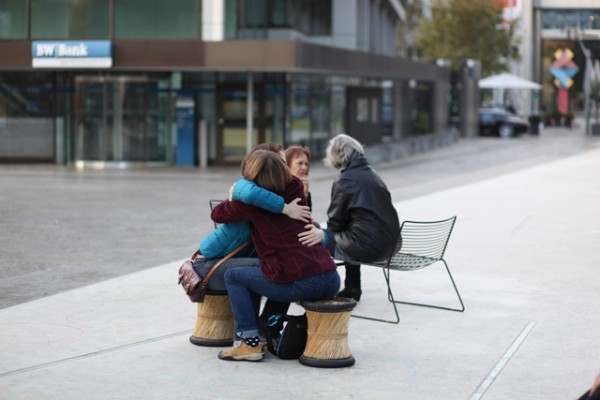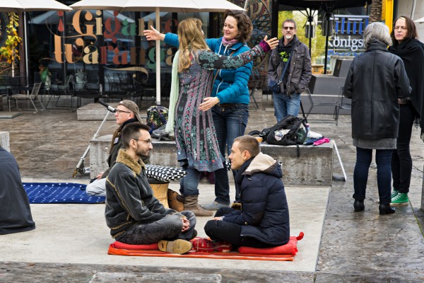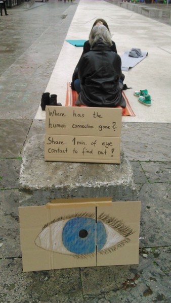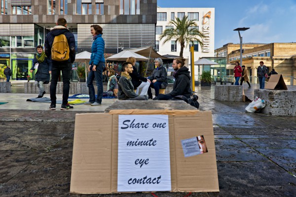 Ein Samstag Mittag, 12 Uhr. Mutige Menschen betreten den Kleinen Schlossplatz, oberhalb des großen, lauten Schlossplatzes im Zentrum der Stadt. Ein geschützter Raum, der trotzdem jede Menge Fußgänger und Zuschauer anzieht. Als nach kurzer Zeit die Sonne hervorkam, wurde der so kreierte Raum immer heller und wärmer… und immer mehr Teilnehmer kamen, um sich dem Augenkontakt-Experiment anzuschließen und sich auf mindestens 1 Minute Augenkontakt mit einem fremdem Menschen einzulassen.