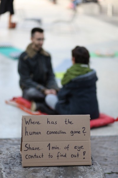 Augen-Kontakt-Experimente sind ein Akt „moderner“ Friedensarbeit in Zeiten von Unruhe und Unsicherheit. Sie schaffen Verbindung und Nähe, die so im Alltag nicht erlebt werden können.